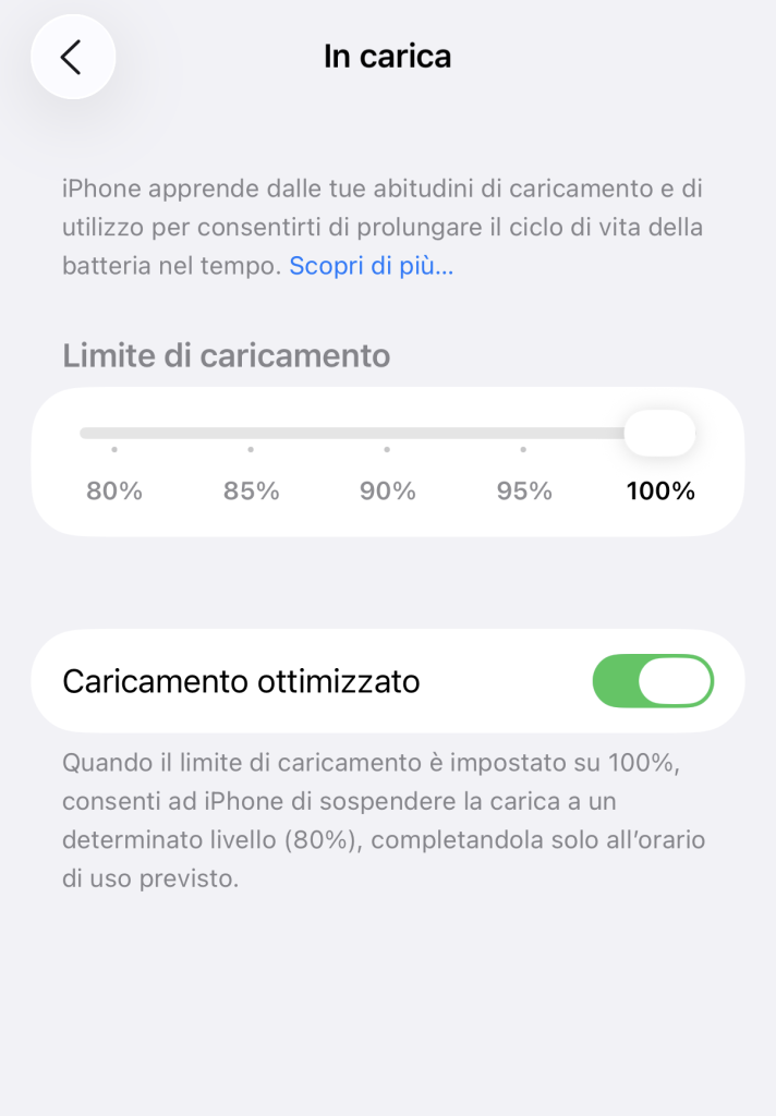 Con iOS 26 puoi anche impostare un limite di carica e vedere in quanto tempo l’iPhone raggiungerà la percentuale desiderata. Una funzione utile per chi vuole preservare la salute della batteria sul lungo periodo.